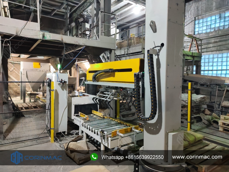 After packaging, the finished bags are conveyed directly into the palletizing area, where the column palletizer automatically picks them up and stacks them in layers.