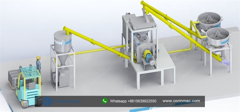 The simple production line CRM2 is suitable for the production of dry mortar, putty powder, plastering mortar, skim coat and other powder products. The whole set of equipment has compact structure, small footprint. It equipped with a ton bag unloading machine to process raw materials and reduce the work intensity of workers. It adopts the weighing hopper to automatically batch ingredients to improve production efficiency. The whole line can realize automatic control.