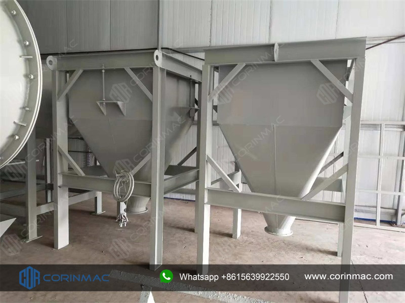 The finished product hopper is a closed silo made of alloy steel plates for storing mixed products. The top of the silo is equipped with a feeding port, a breathing system and a dust collection device. The cone part of the silo is equipped with a pneumatic vibrator and an arch breaking device to prevent the material from being blocked in the hopper.